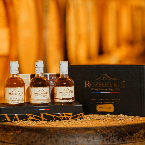 Découvrez le Coffret Tripack Parcellaires Rozelieures : une dégustation unique de 3 single malts français issus de nos propres parcelles d’orge en Lorraine.